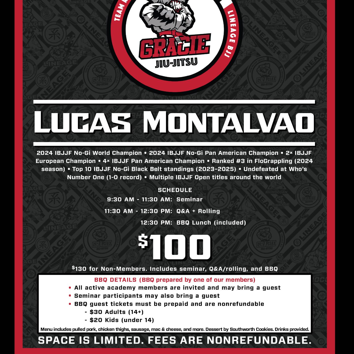 Join us for our annual Super Seminar and BBQ featuring Lucas Montalvão — 2024 IBJJF No-Gi World Champion (Ultra-Heavy), 4x Pan Am Champion, 2x European Champion, and current Top 10 competitor in FloGrappling’s +220 lbs division.
